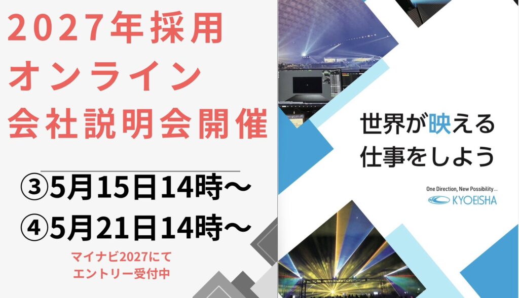 教映社では2027年採用のオンライン会社説明会を5月15日(金)、5月21日(木)の両日とも14時から開催いたします。
